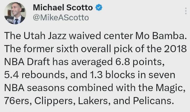 爵士队官方宣布:穆罕默德·班巴已被解雇。班巴在今年季前赛与爵士队的一场比赛中出场。对阵开拓者队的比赛中,他在不到九分钟的时间内得到8分、3个篮板、2次助攻和1次投篮。班巴出生于1998年5月12日,今年27岁。他在第18届第1轮第6位被选中。身高2.13米,翼展2.39米。他非常有才华,是2K模特的儿子。出道后,他被誉为下一个“魔兽”霍华德。然而,他无法参加比赛,至今仍处于失业状态。值得注意的是,今夏休赛期还有CBA球队渴望与班巴合作。此前,他在与爵士队签约后曾短暂搁置。现在这个人有空了,也许我们可以认真谈谈在中国打球的事情。短短七年时间里,班巴在NBA生涯中效力过五支球队:魔术队、湖人队、费城队、快船队和鹈鹕队。他只上诉在爵士季前赛中染红,所以他不算在内。常规赛期间,他场均上场16.8分钟,得到6.8分、5.4个篮板、1.3次盖帽,投篮命中率为47.7%。季后赛他场均上场3.3分钟得到0分1篮板0.3助攻0.3盖帽。他的贡献微不足道。事实是,即使你有身体天赋,如果没有高尔夫智慧和技巧,仍然很难在NBA生存。