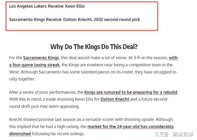 湖人队目前表现出色,稳居西部前四。当然,如果说提升的空间,也是非常大的。尤其是湖人队的打击阵容深度并不突出。球队中有很多边缘球员。如果有机会,将其作为改善阵容的筹码似乎也是一个可行的解决方案。一位媒体前锋建议湖人队可以考虑国王队的商业工程师基昂·埃利斯。具体来说,湖人队收购二年级神枪手道尔顿·克内希特的交易可能会被搁置。另外,湖人队将从2032年开始再送出一个二轮选秀权。考虑到克内克特的市值太低,可以忽略不计,湖人队很可能会花两到三个二轮选秀权来换取基恩·埃利斯。绝对值得一试。你可能不太了解科恩·埃利斯,但他是典型的球技胜过他的代表球员。这是声誉所暗示的。科恩·埃利斯是一名落选秀球员,但自从进入联盟以来他一直在稳步进步。从23-24赛季开始,科恩·埃利斯成为国王队不可或缺的粘合剂。在主力缺阵的情况下,他将在首发十一人中担任替补。科恩·埃利斯本赛季场均贡献7.7分和1.6个篮板。他的数据并不是特别令人印象深刻,但他的三分命中率接近 50%,并且场均抢断 1.5 次。然而,国王队根本没有足够的优质后卫。与欧洲男篮杯相比,施罗德则完全不同。由于威斯布鲁克只是简单地放在前锋位置上,科恩·埃利斯被迫承担了很多控球任务,这使得他的表现不那么令人印象深刻。不过,如果科恩·埃利斯加盟湖人队,这种情况将会发生巨大的改变。那是因为有了东契奇和里维斯,他通常不需要那么多地持球。此外,詹姆斯近随着他的回归,湖人队的基恩·埃利斯在阵容中的角色非常简单:为进攻创造空间,尽可能多地投中空位三分球。防守方面,基昂·埃利斯将发挥更大的作用,完全减轻东契奇的压力。换句话说,他就像年轻时的斯玛特,但合同较短。与此同时,25 岁的 Keion Ellis 可能会成为球队长期计划的一部分。至于道尔顿·克内希特,他目前的发展肯定非常令人失望。毕竟他是联盟新人,经常被用作奇兵。结果,克内希特无论是在夏季联赛还是季前赛中都无法发挥出作用。本赛季您只写下了两次四位数或次。而且,内克特的强项本来就是投篮能力。然而,本赛季到目前为止,他的三分球命中率为32.5%。湖人队可以及时减少损失,并寻找替代正在寻求升级的内克特的人选。